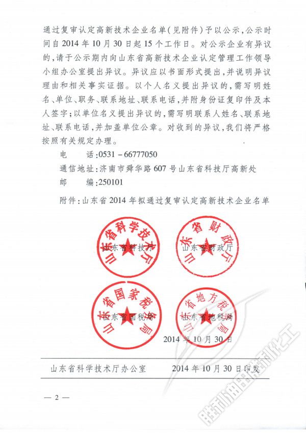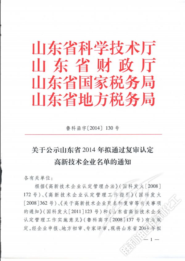 關于公(gōng)示山東省(sheng)2014年拟通過(guò)複審認定(ding)高新技術(shù)企業名單(dan)的通知