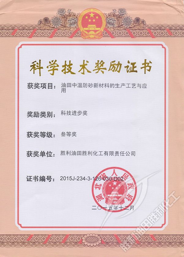 **産品“油田(tian)中溫防砂新材(cai)料”獲湖北省科(ke)學進步獎
